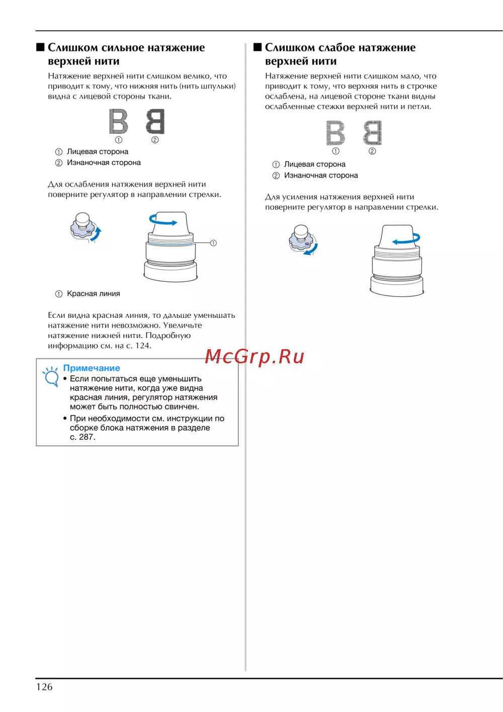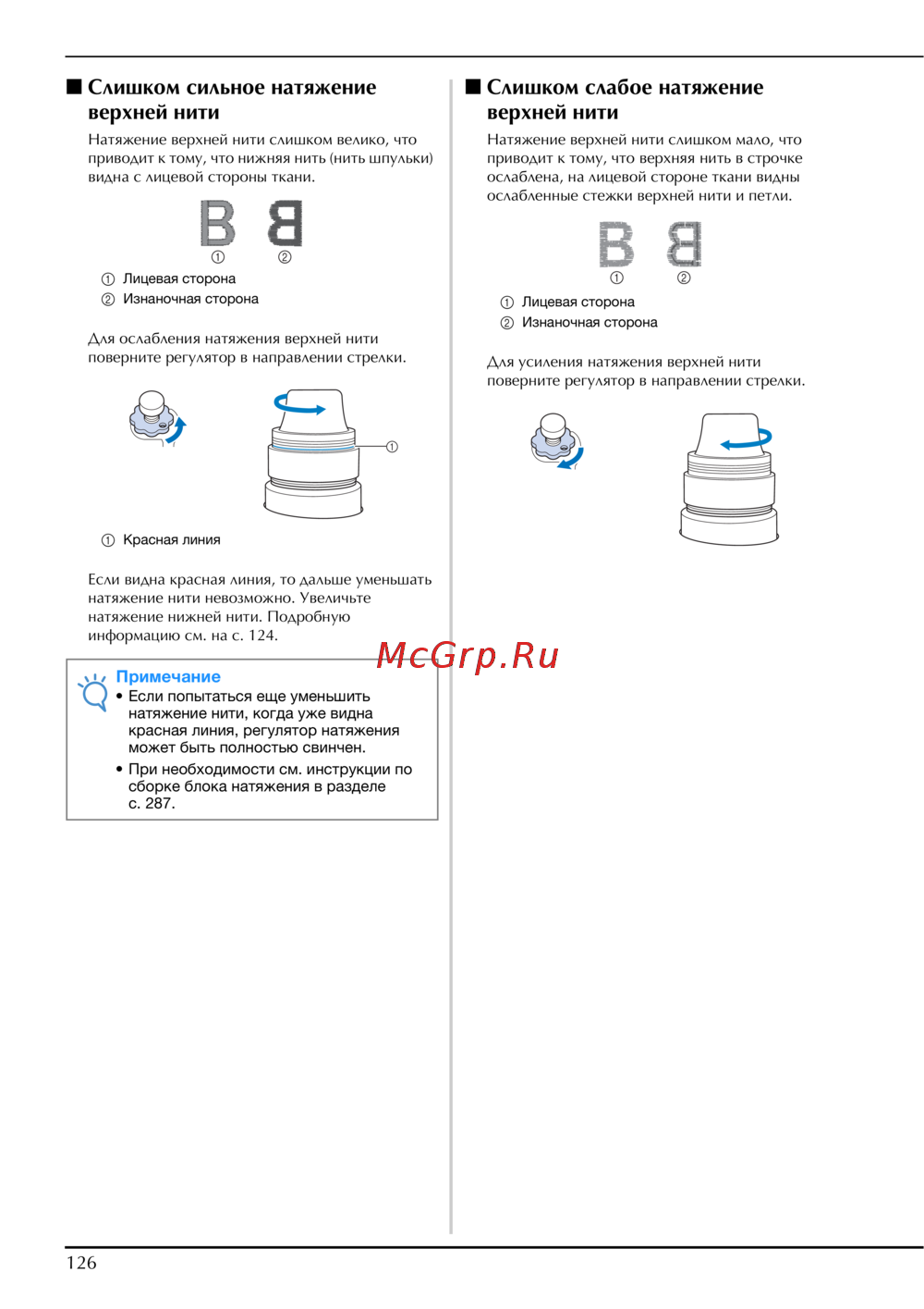 - Уменьшите натяжение верхней нити и убедитесь что при протягивании нити регулятор натяжения вращается p.294