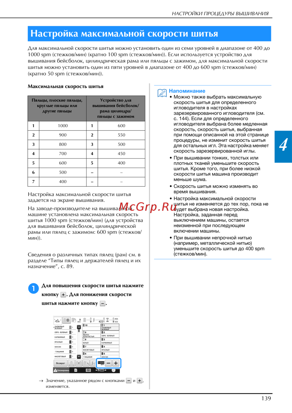 Узнайте, как настроить максимальную скорость шитья на вышивальных машинах. Подробности о диапазонах скорости и настройках для различных типов пялец.