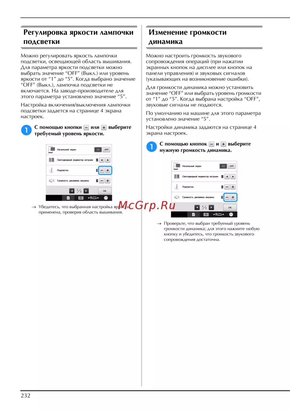 Узнайте, как настроить яркость подсветки и громкость звуковых сигналов на устройстве для вышивания. Простые шаги для оптимизации работы.