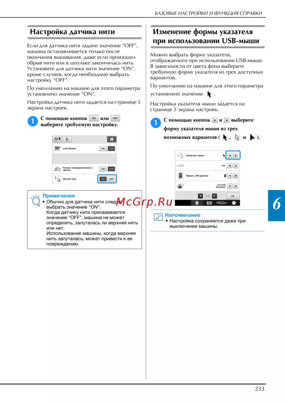 Узнайте, как правильно настроить датчик нити и форму указателя мыши на швейной машине. Следуйте простым шагам для оптимизации работы устройства.