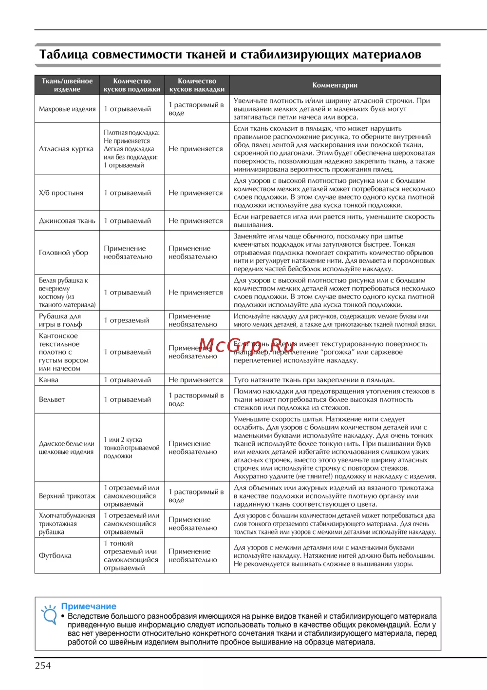 Brother PR 1050X ENTREPRENEUR PRO X (PR1050X) — совместимость тканей и стабилизирующих материалов для шитья [256/316]