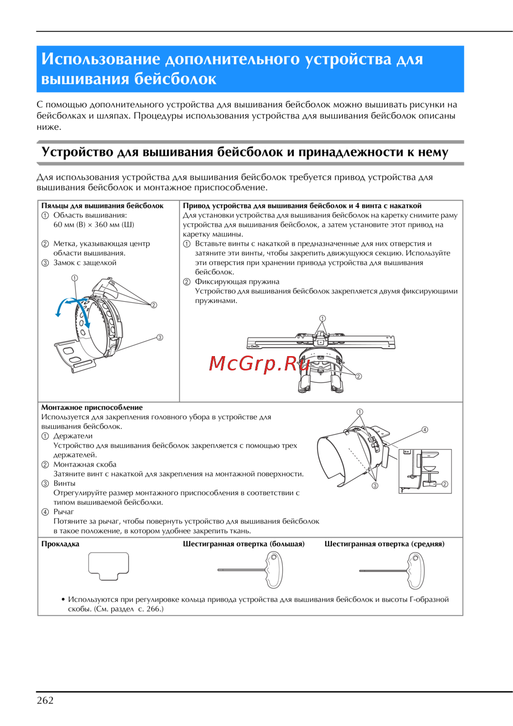• Используются при регулировке кольца привода устройства для вышивания бейсболок и высоты Г-образной