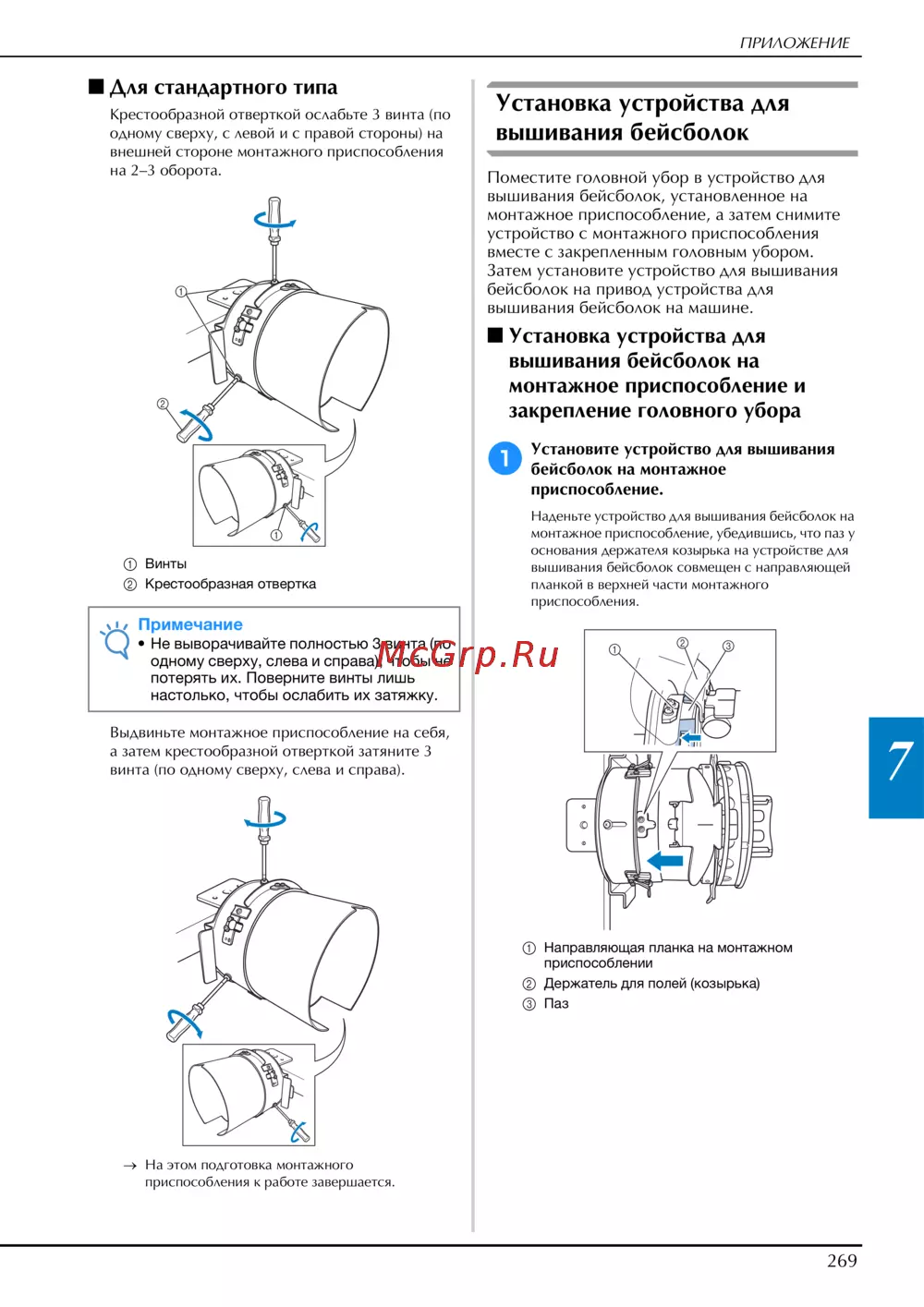 - Снимите держатель козырька и разомкните фиксатор на устройстве для вышивания бейсболок снимите зажимы а затем снимите бейсболку p.277