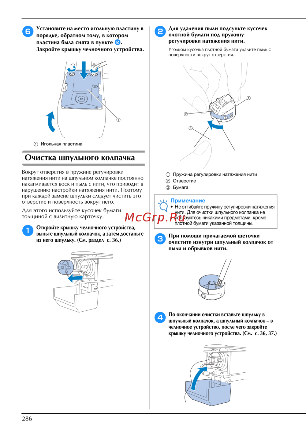- Очистка шпульного колпачка p.288