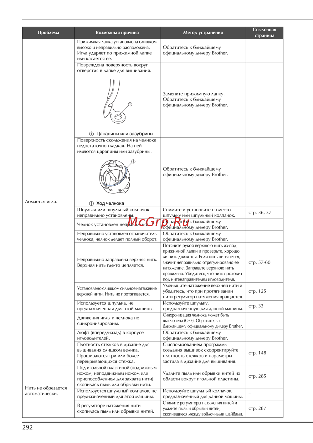 - Используется шпульный колпачок не предназначенный для этой машины p.294