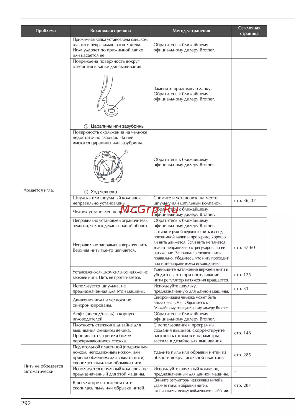 - Не работает механизм автоматической заправки нити в иглу p.296