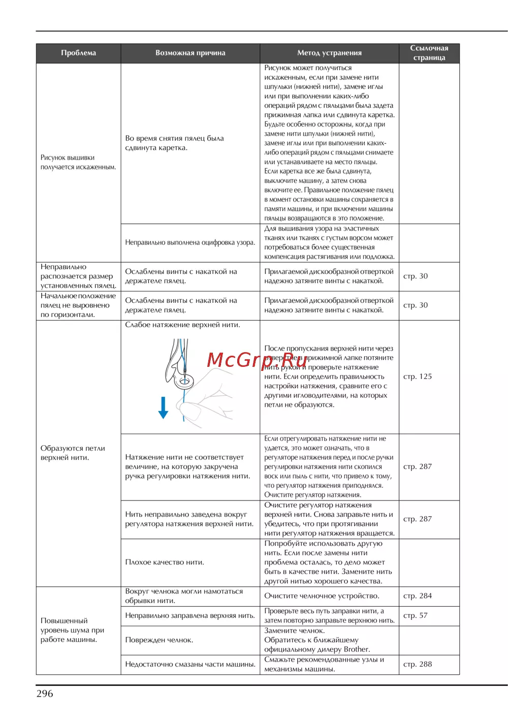 - Не работает механизм автоматической заправки нити в иглу p.296
