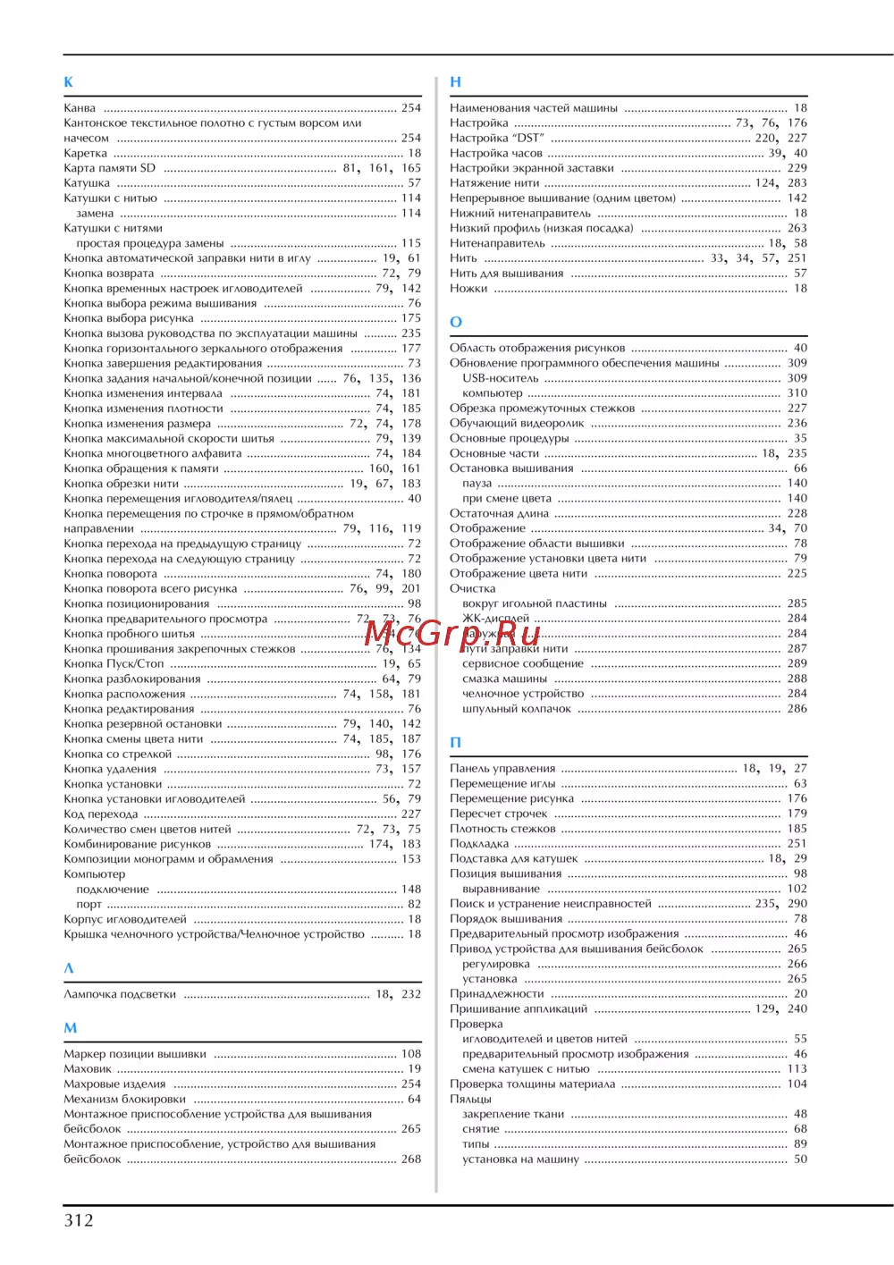 - Погнут крючок на механизме автоматической заправки нити в иглу p.299