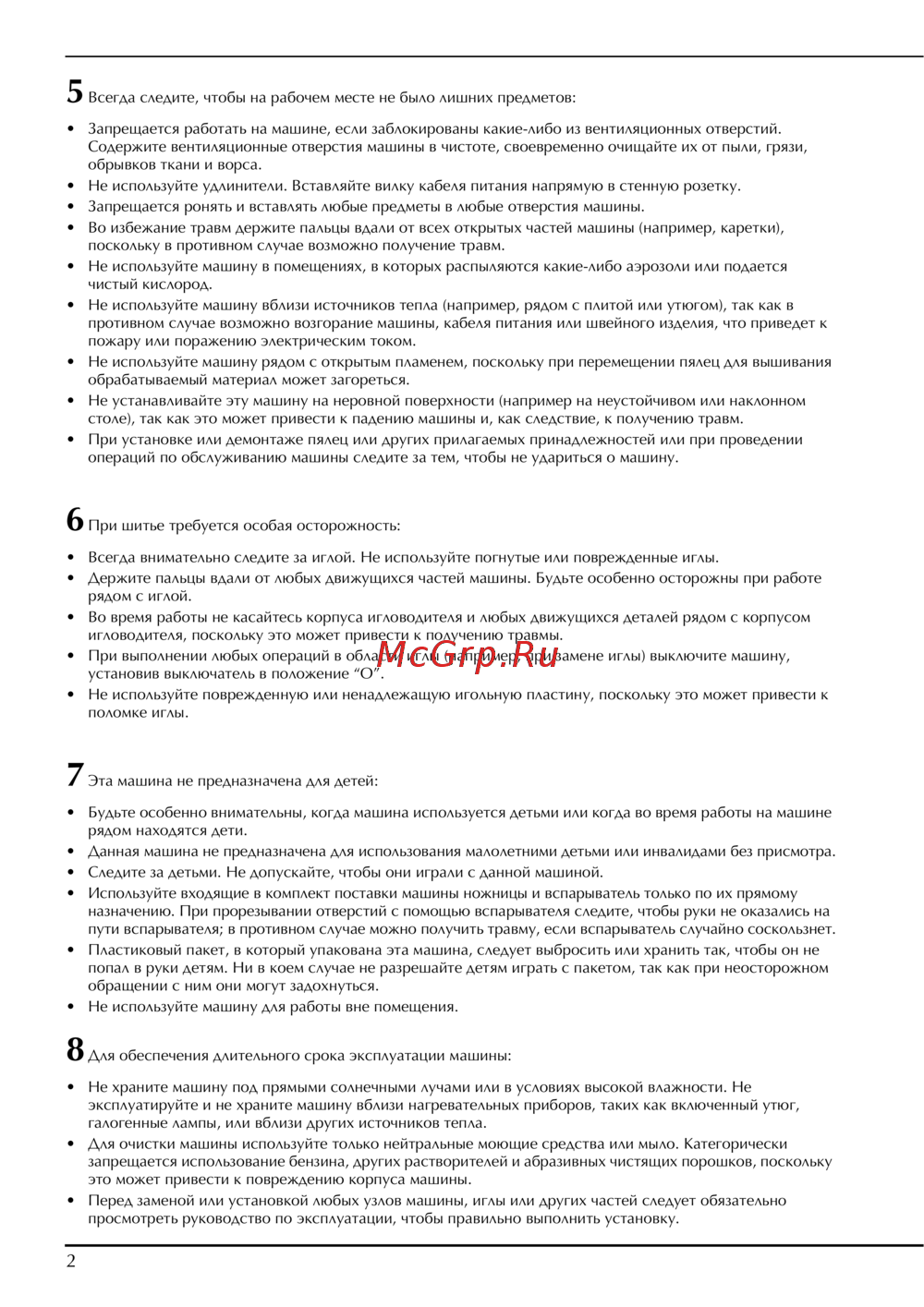 противном случае возможно возгорание машины, кабеля питания или швейного изделия, что приведет к