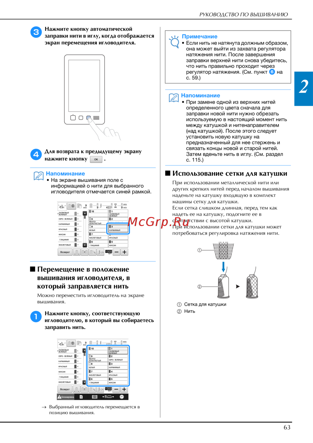 Изучите пошаговое руководство по вышиванию, включая заправку нити в иглу и использование сетки для катушки. Убедитесь в правильной натяжке нити для качественного результата.