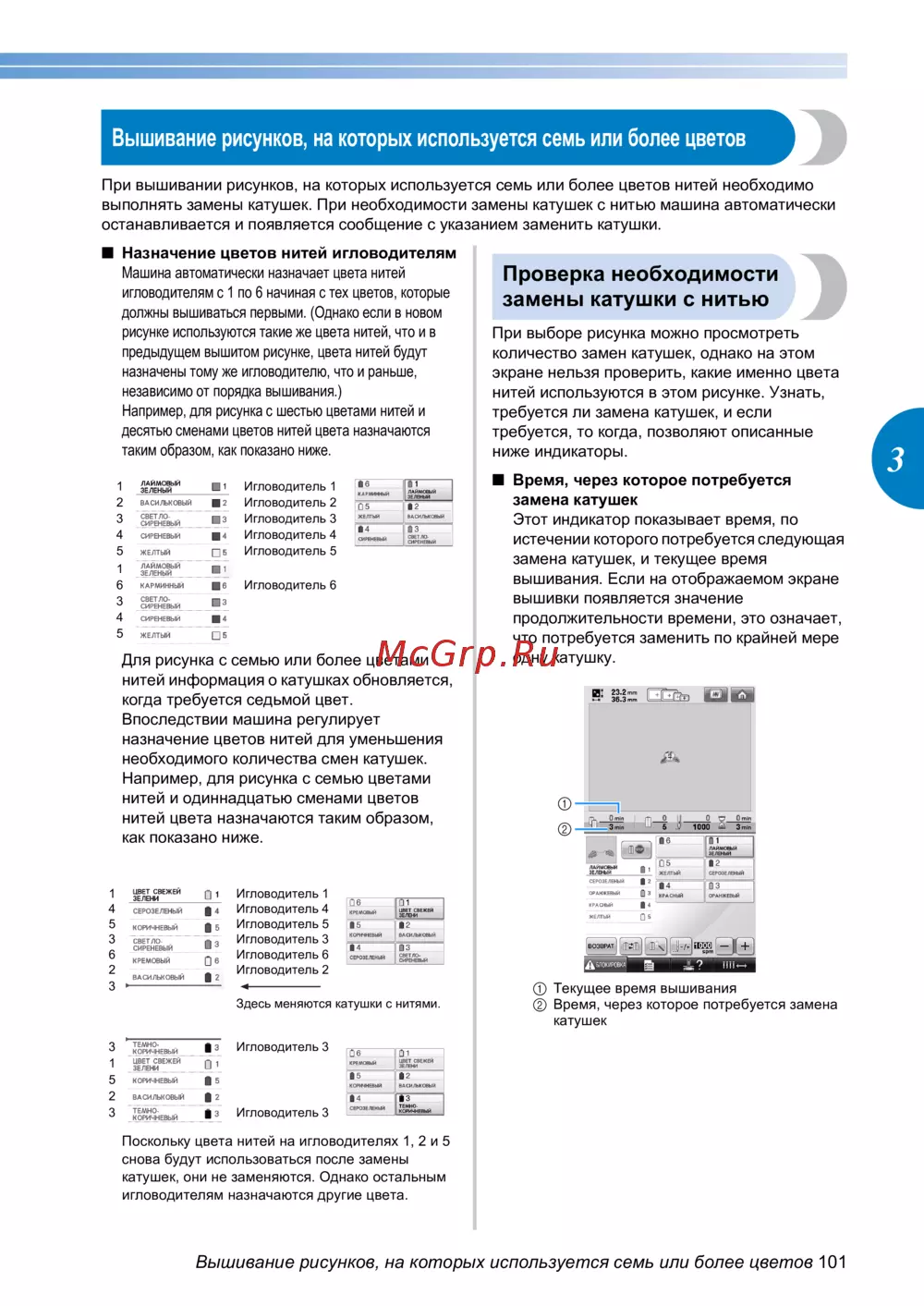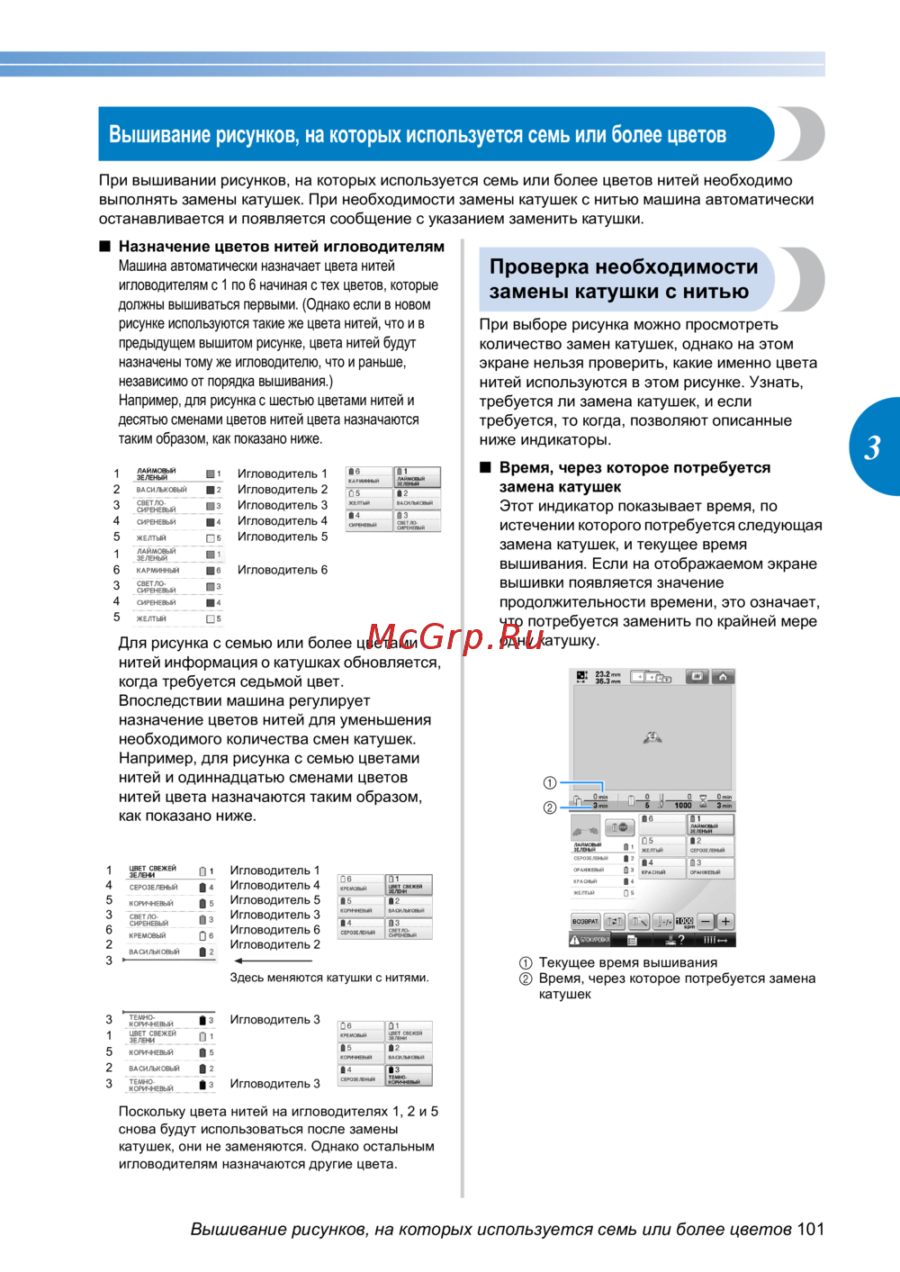 Узнайте о процессе вышивания рисунков с семью и более цветами нитей. Описание замены катушек и назначения цветов игловодителям для оптимизации работы.