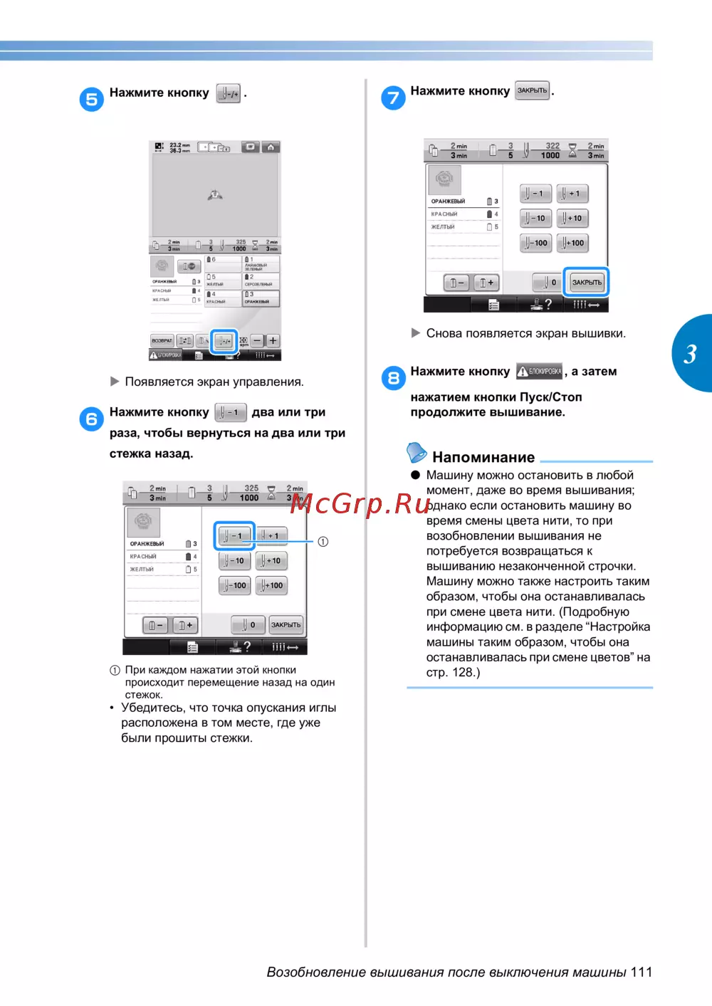 - Вышивание с начала или с середины рисунка 108 возобновление вышивания после выключения машины 10 p.16