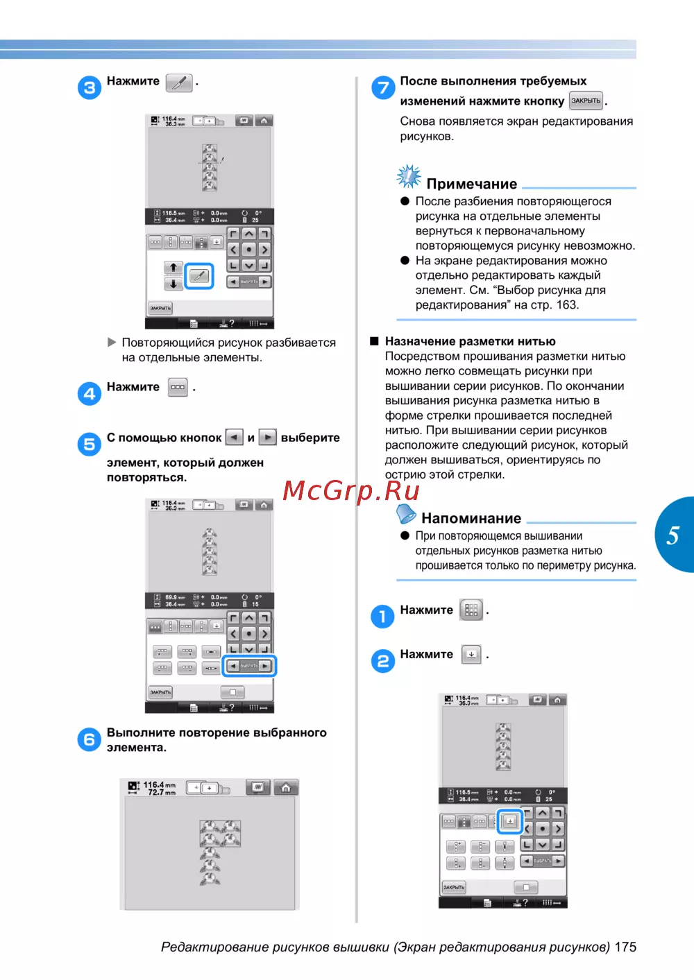 Редактирование рисунков вышивки (Экран редактирования рисунков) 175
