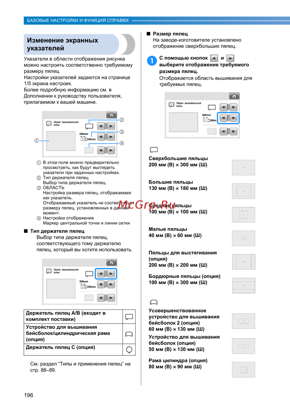 Brother PR 655E ENTREPRENEUR (PR655E) — настройки указателей и пялец для вышивания: руководство [198/280]
