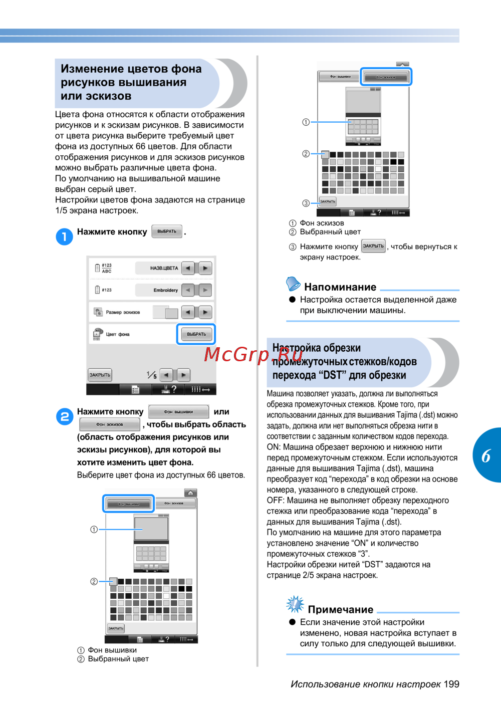 Brother PR 655E ENTREPRENEUR (PR655E) — настройка цветов фона и обрезки стежков для вышивания [201/280]