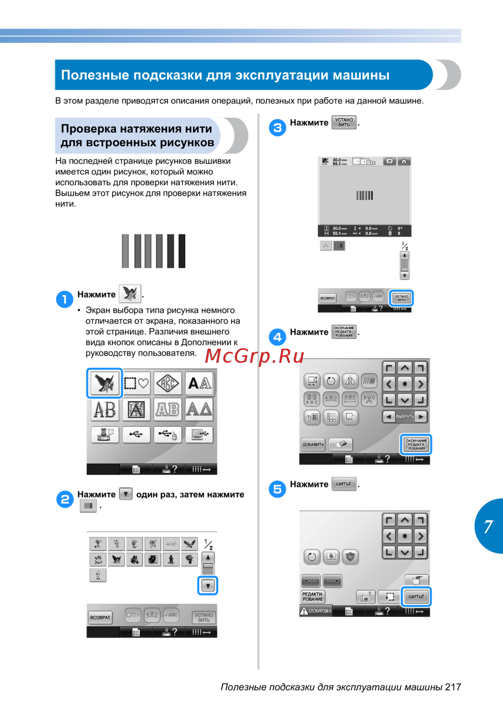 - Переключение цветов нитей на экране 00 вышивание рисунков на которых используется семь или более цветов 01 p.16