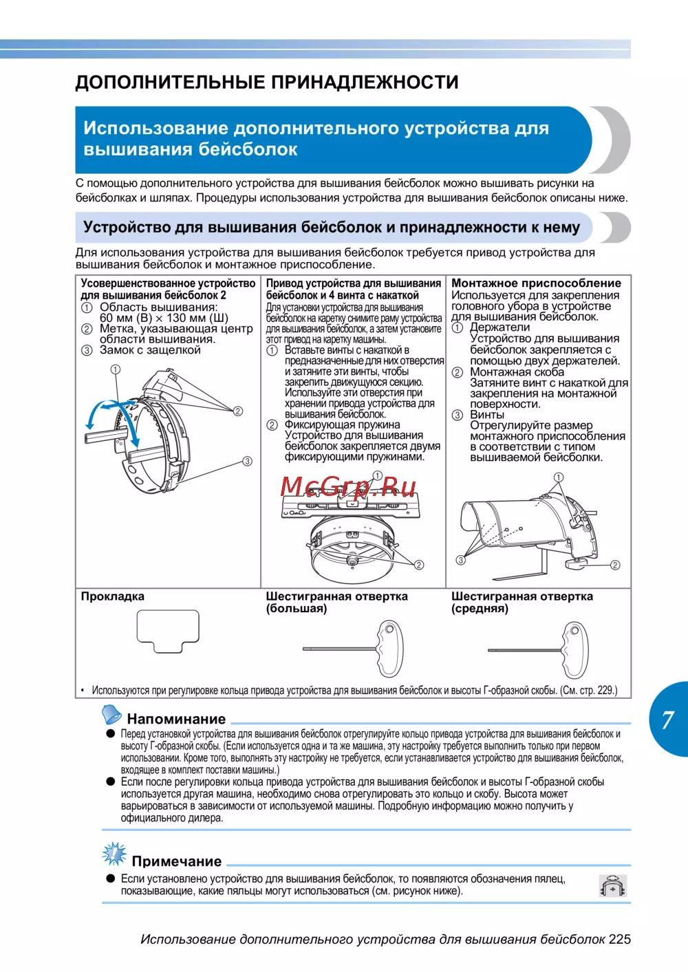 - Использование дополнительного устройства для вышивания бейсболок 237 p.239