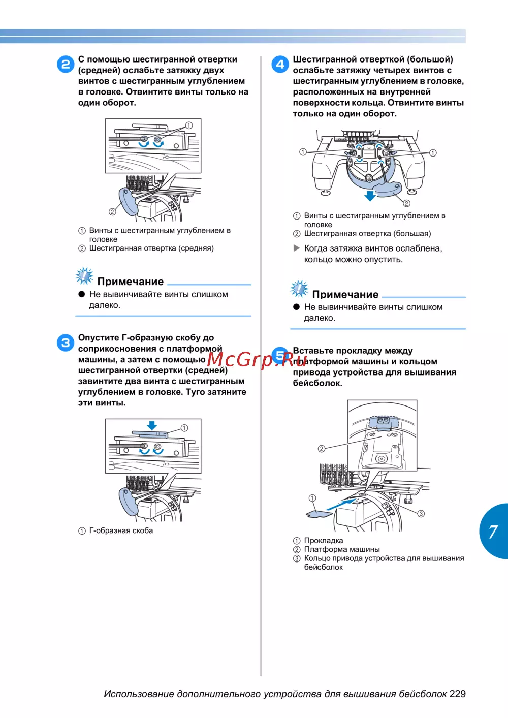 Использование дополнительного устройства для вышивания бейсболок 229