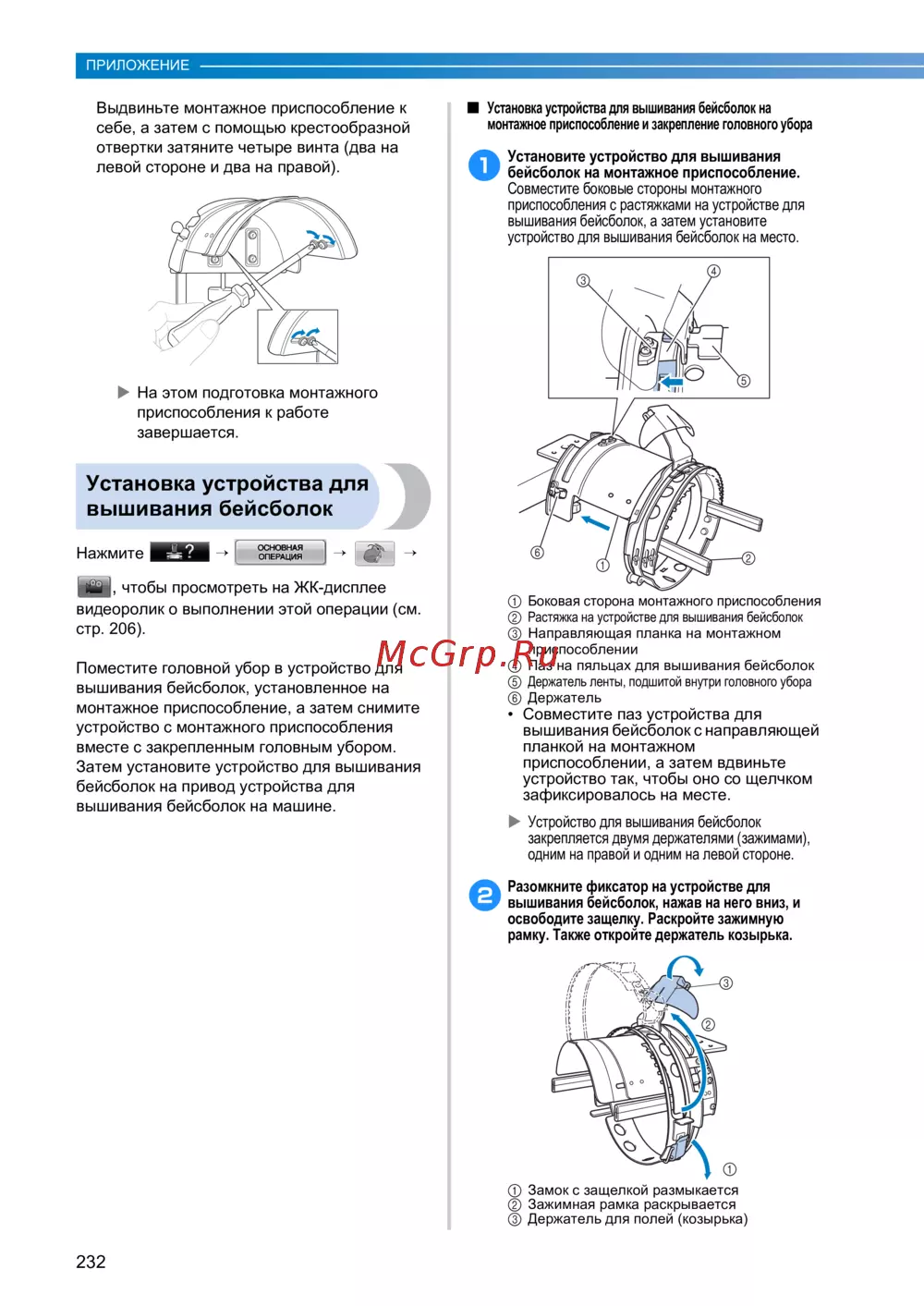 - Использование дополнительного устройства для вышивания бейсболок 237 p.239