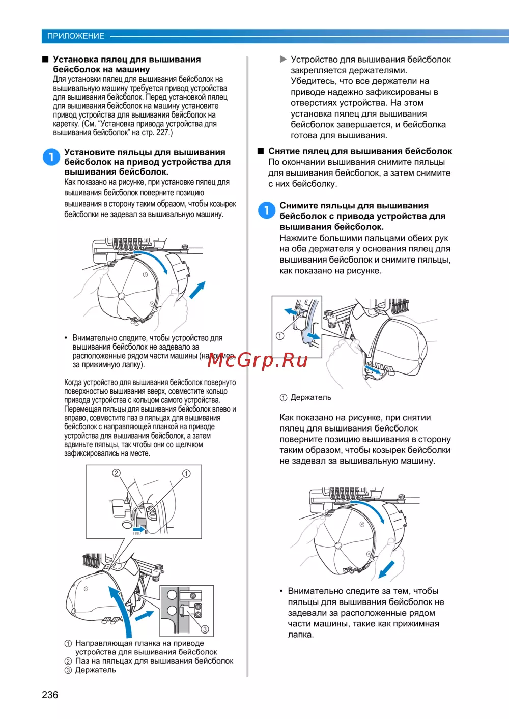 - Использование дополнительного устройства для вышивания бейсболок 237 p.239