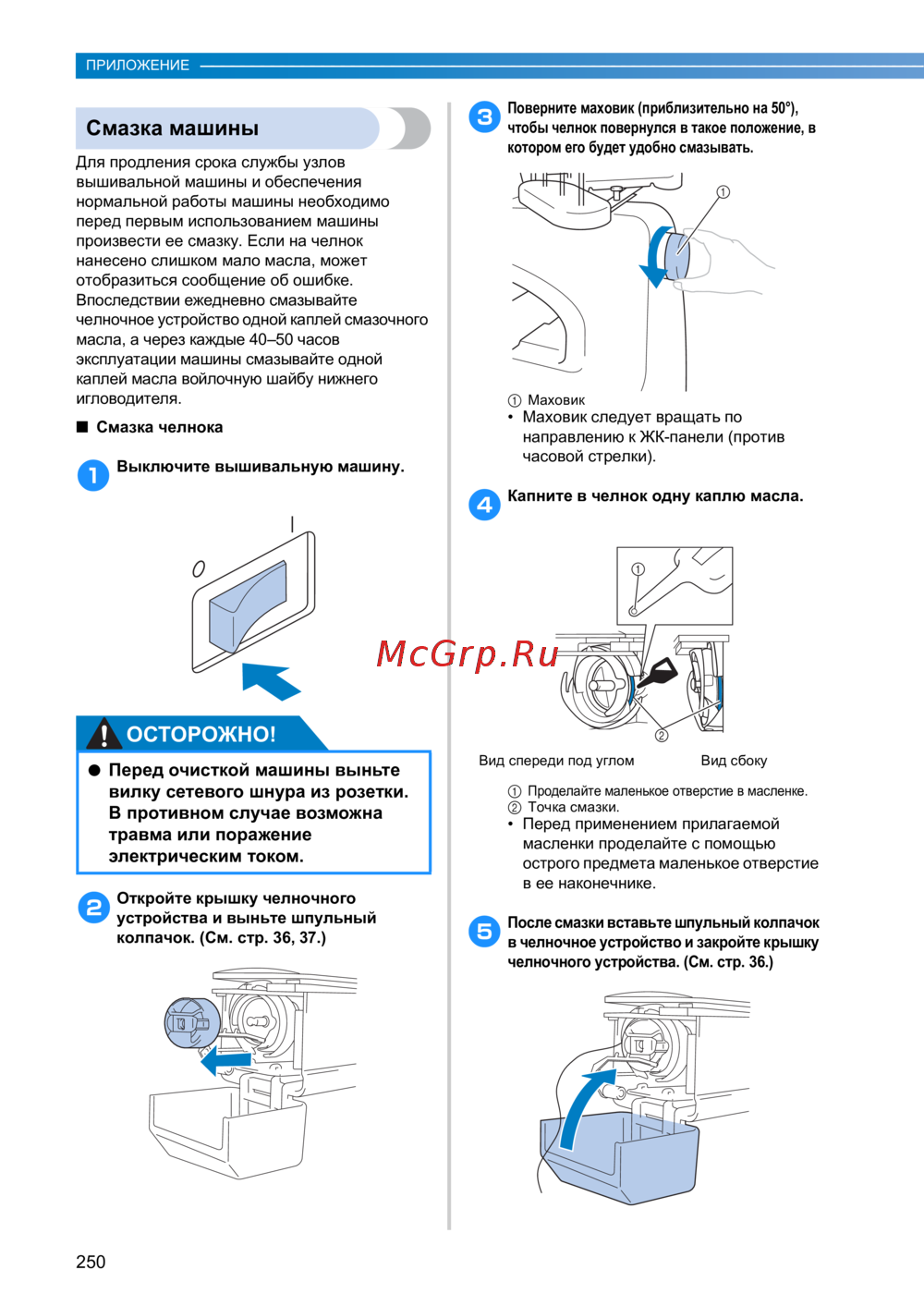 - Перед очисткой машины выньте вилку сетевого шнура из розетки в противном случае возможна травма или поражение электрическим током p.248