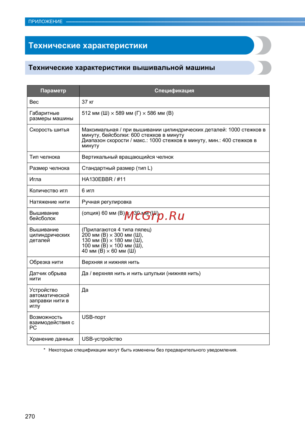 ![Brother PR 655E ENTREPRENEUR (PR655E) [272/280] Технические характеристики вышивальной машины](/views2/1342073/page272/bg110.png)