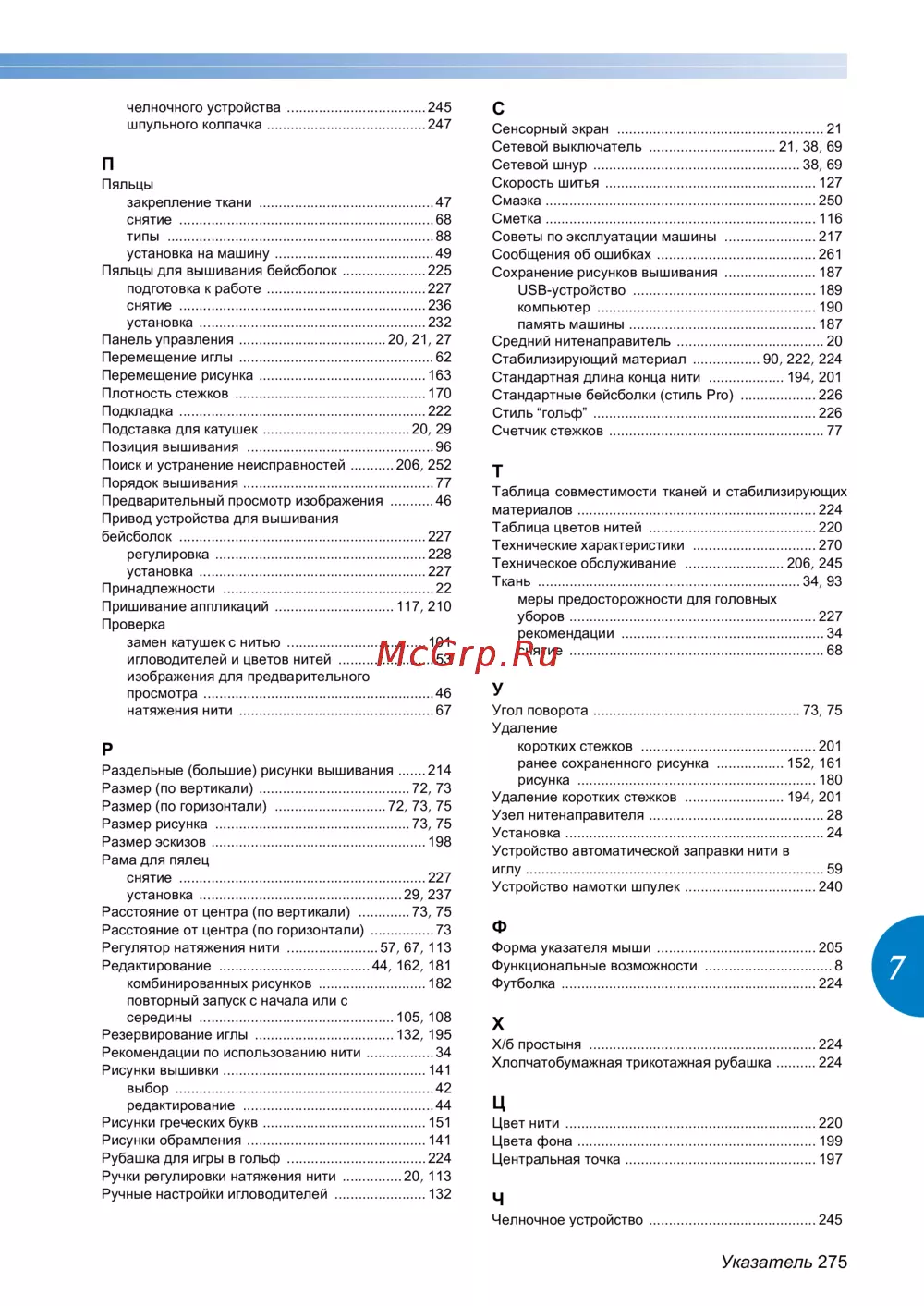- Использование дополнительного устройства намотки шпулек 243 p.245