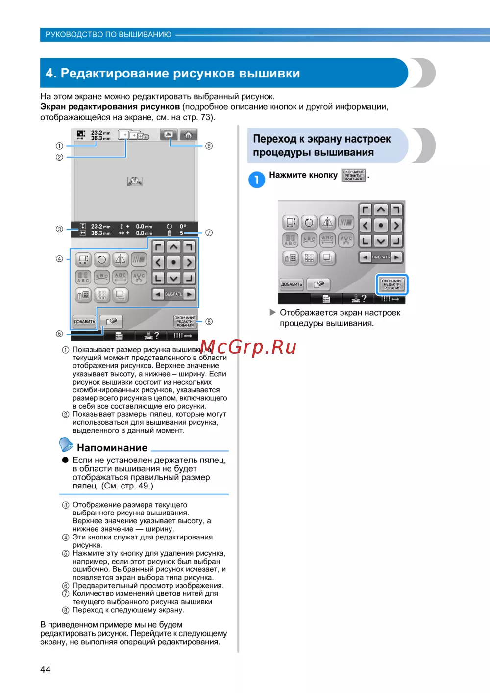 - Не выполняйте вышивание более чем на четырех перекрывающихся уровнях p.241