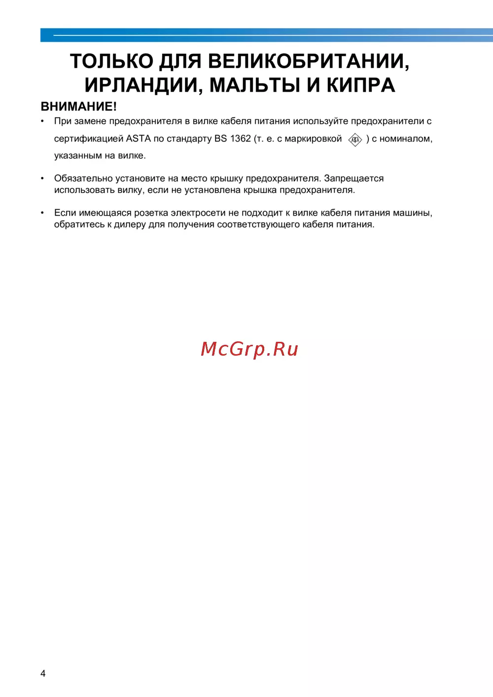 - Перед очисткой машины выньте вилку сетевого шнура из розетки в противном случае возможна травма или поражение электрическим током p.248
