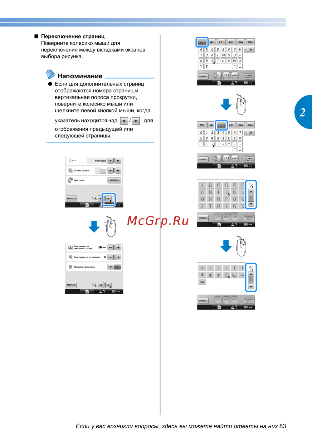 - Переключение цветов нитей на экране 00 вышивание рисунков на которых используется семь или более цветов 01 p.16