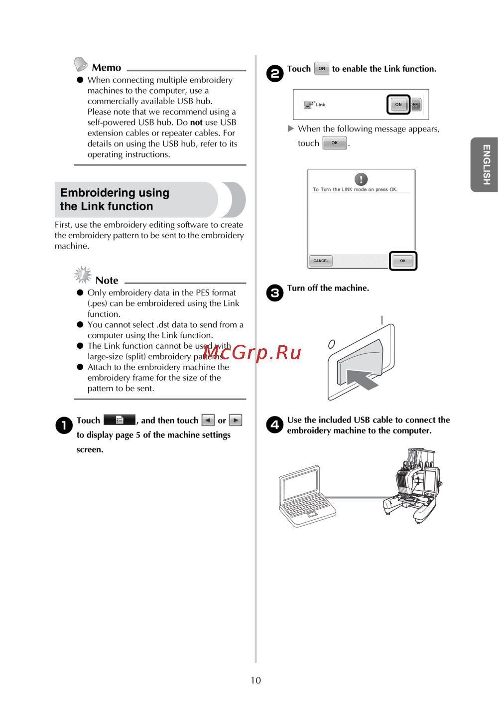 - Передача рисунков вышивания с компьютера на вышивальную машину функция link связь p.136