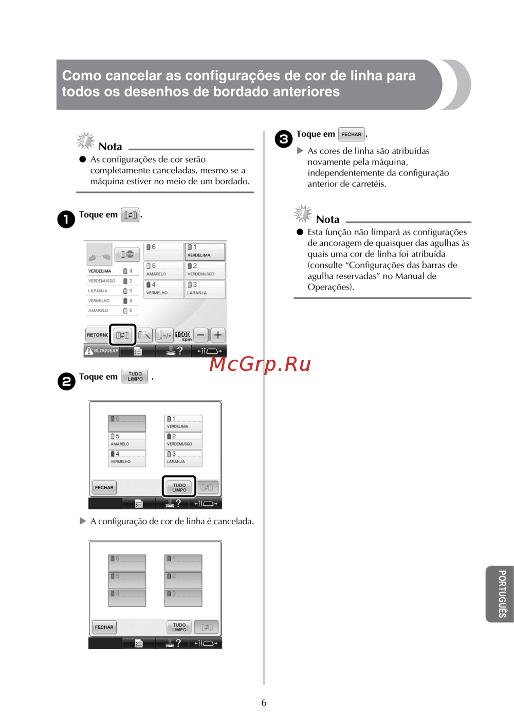 - Como cancelar as configurações de cor de linha para todos os desenhos de bordado anteriores p.115