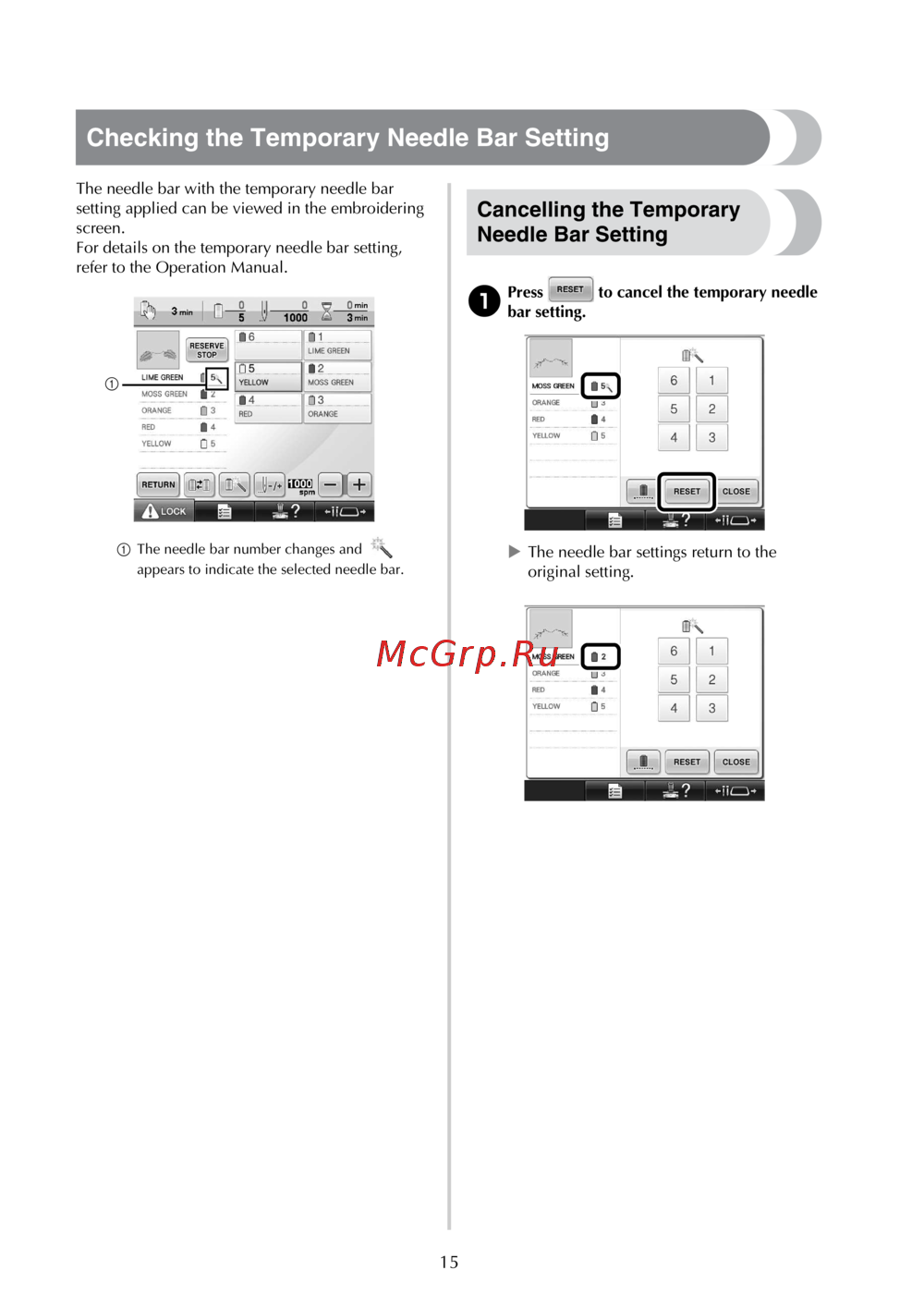- Cancelling the temporary needle bar setting p.16