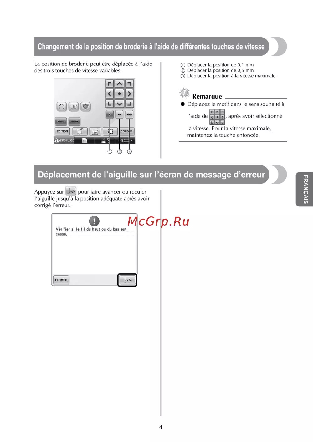 - Изменение положения вышивки при помощи различных кнопок скорости p.131