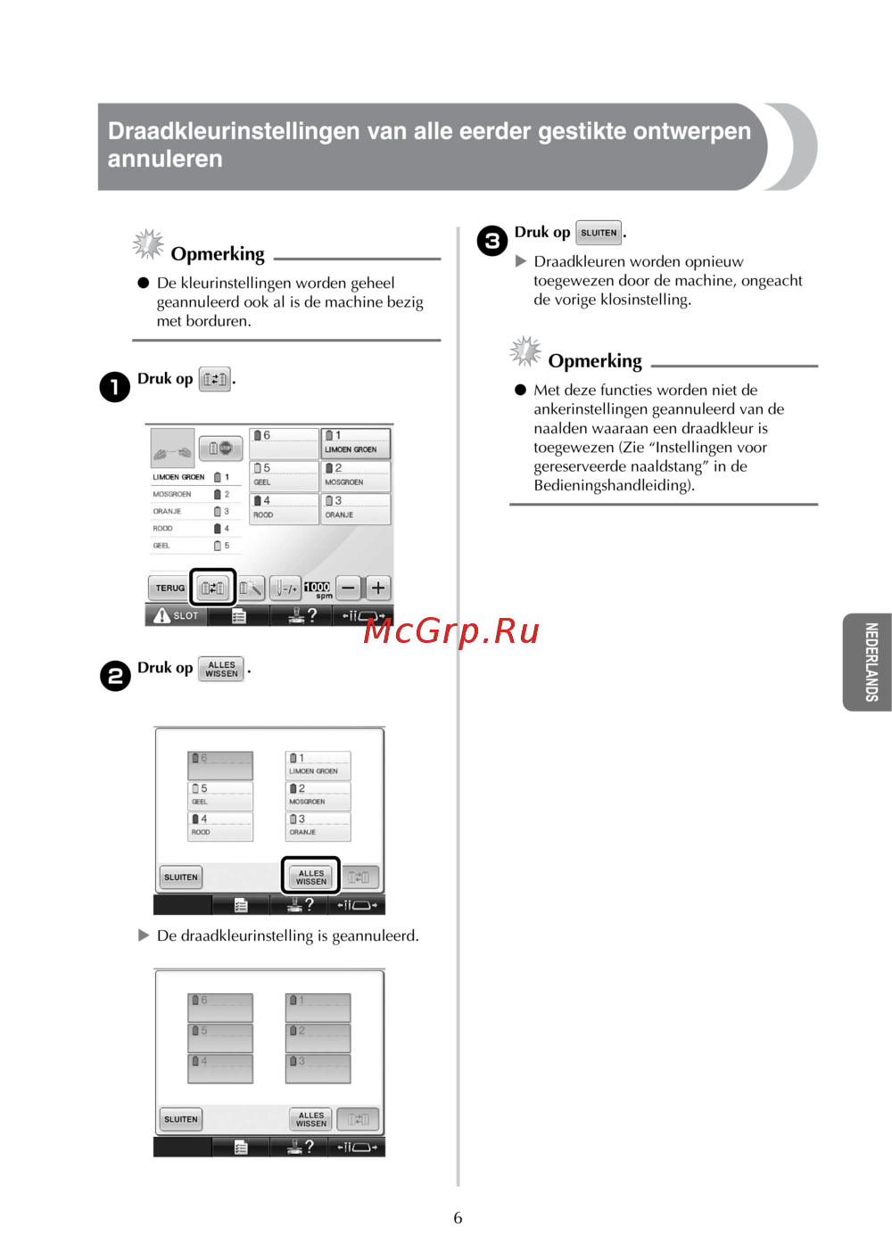 - Löschen der garnfarbeneinstellungen für alle bereits gestickten designs p.25