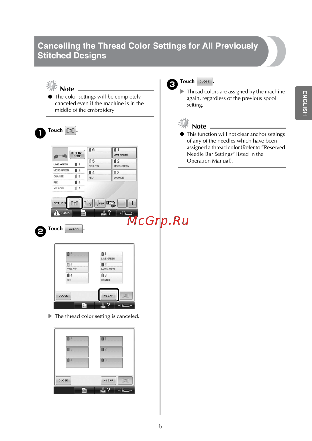 - Отмена настроек цветов нитей для всех ранее вышитых рисунков p.133