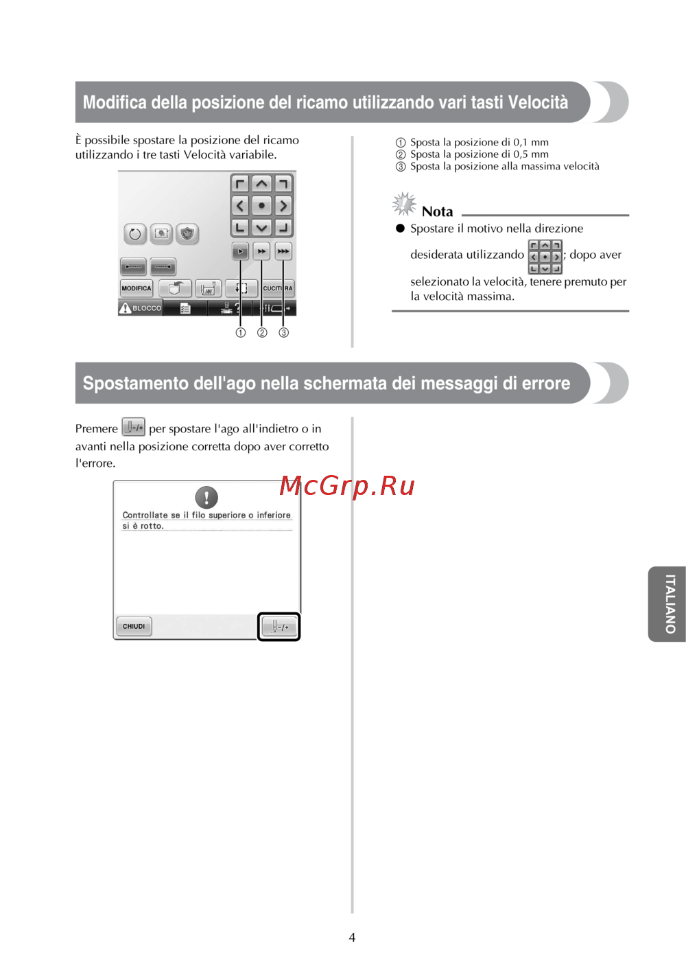 - Изменение положения вышивки при помощи различных кнопок скорости p.131