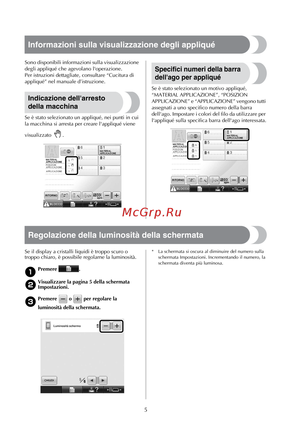 Scopri come visualizzare e regolare gli appliqué con istruzioni dettagliate. Impara a impostare i colori del filo e a regolare la luminosità dello schermo.