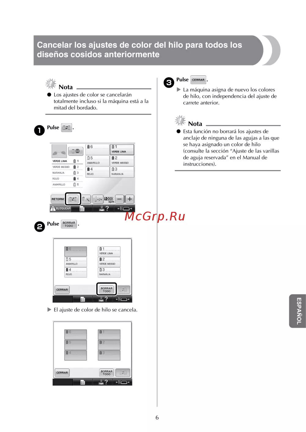 - Cancelling the thread color settings for all previously stitched designs p.7