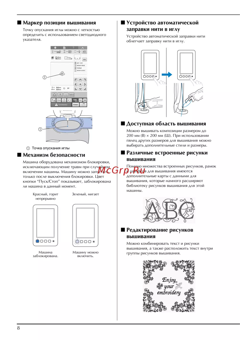 - Возможность установки четырех катушек с нитью для вышивания p.9