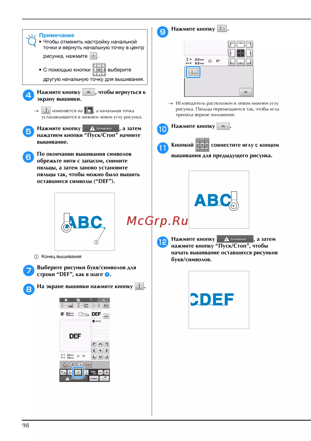 - Эта глава содержит описание способов выполнения различных операций вышивания создания привлекательных вышивок а также подробную информацию об обслуживании машины и корректирующих действиях которые должны предприниматься при возникновении различных проблем p.155
