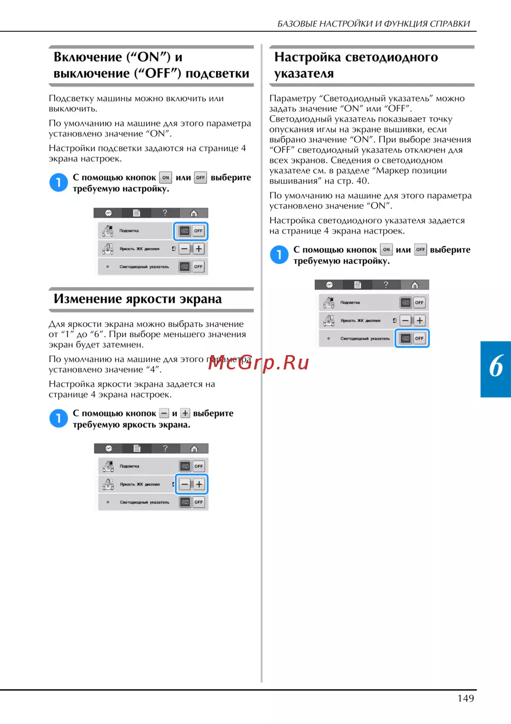 Узнайте, как включить и настроить подсветку, яркость экрана и светодиодный указатель на вышивальных машинах. Простые шаги для оптимизации работы.