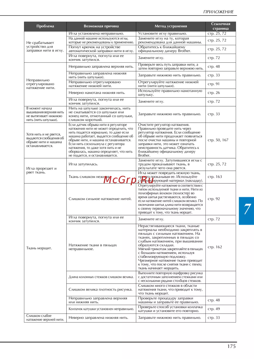 - Повреждено устройство автоматической заправки нити в иглу p.175