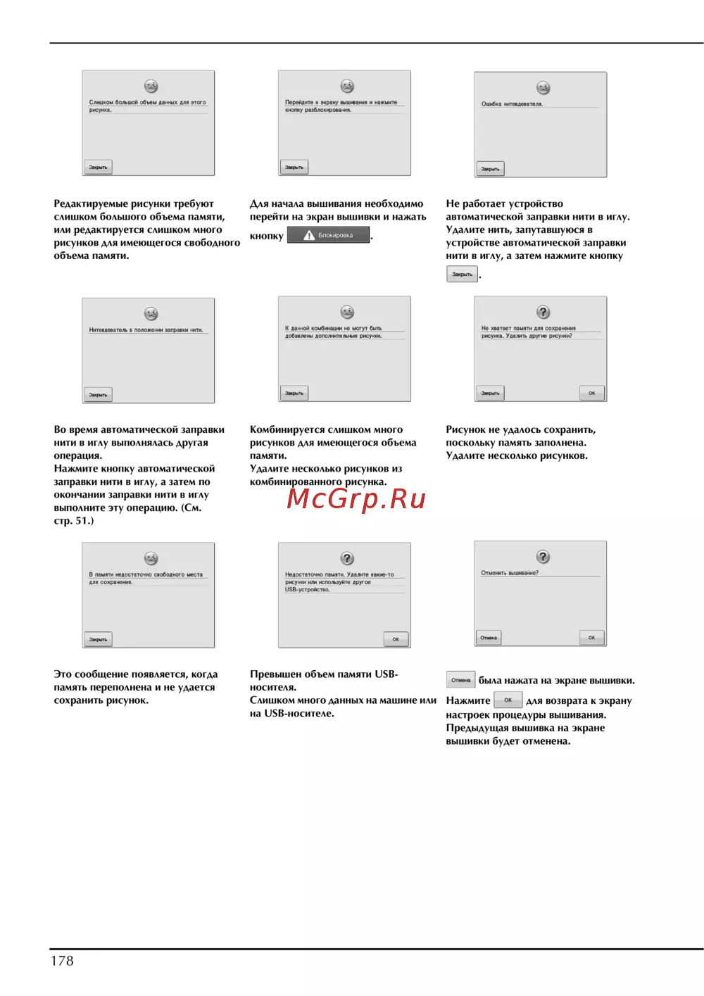 - Если нажать кнопку пуск стоп в тот момент когда машина настроена неправильно или же если операция выполняется неправильно то машина останавливается и звучит сигнал зуммера а на жк дисплее появляется сообщение об ошибке если появляется сообщение об ошибке решите проблему в соответствии с инструкциями в этом сообщении p.179