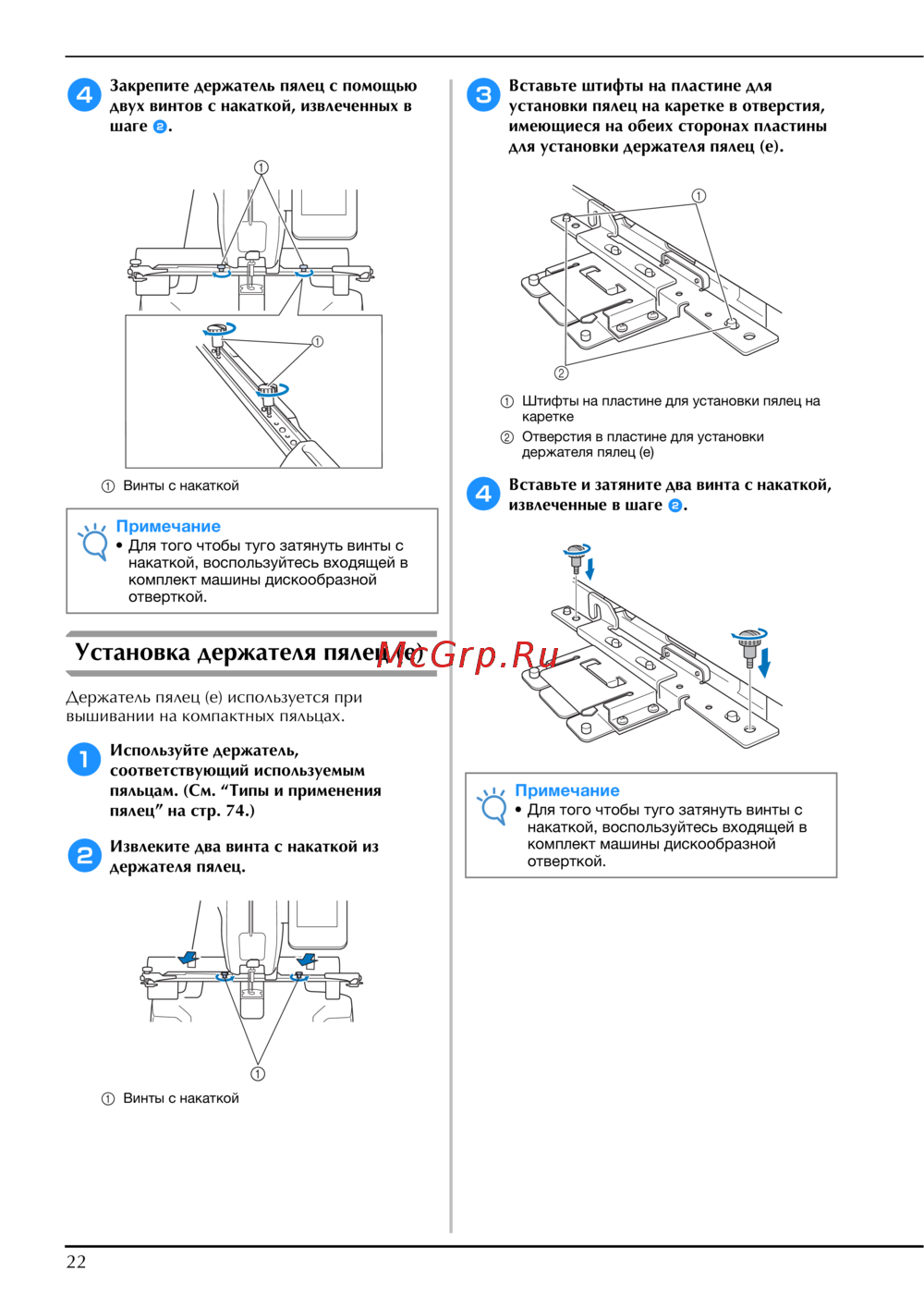 - Возможность установки четырех катушек с нитью для вышивания p.9