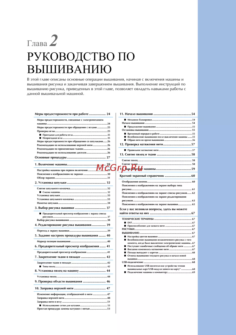 - Эта глава содержит описание способов выполнения различных операций вышивания создания привлекательных вышивок а также подробную информацию об обслуживании машины и корректирующих действиях которые должны предприниматься при возникновении различных проблем p.155
