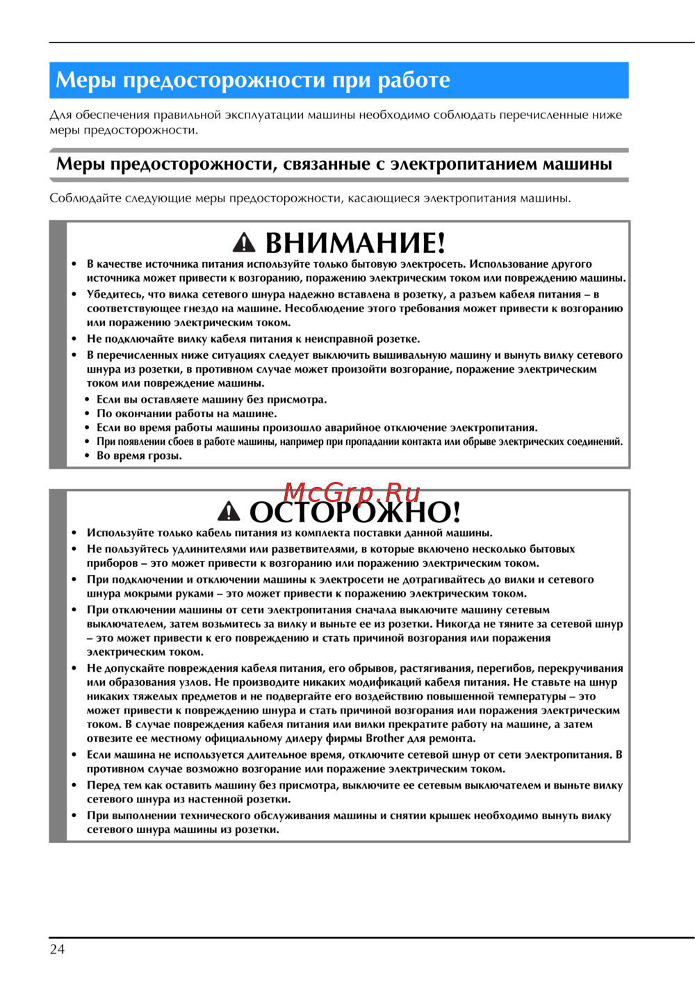 Brother VR — меры предосторожности при эксплуатации электрических машин [26/192]