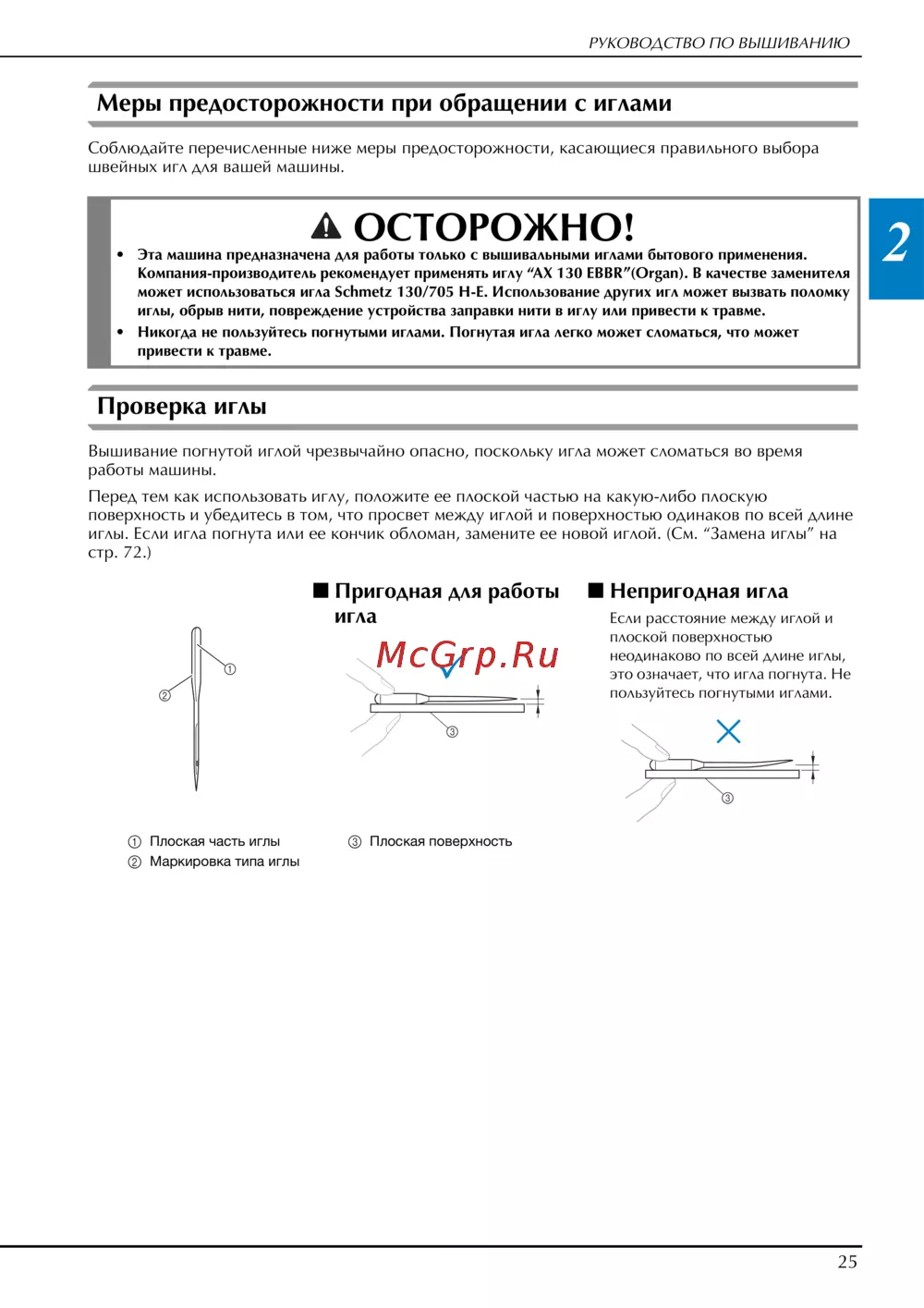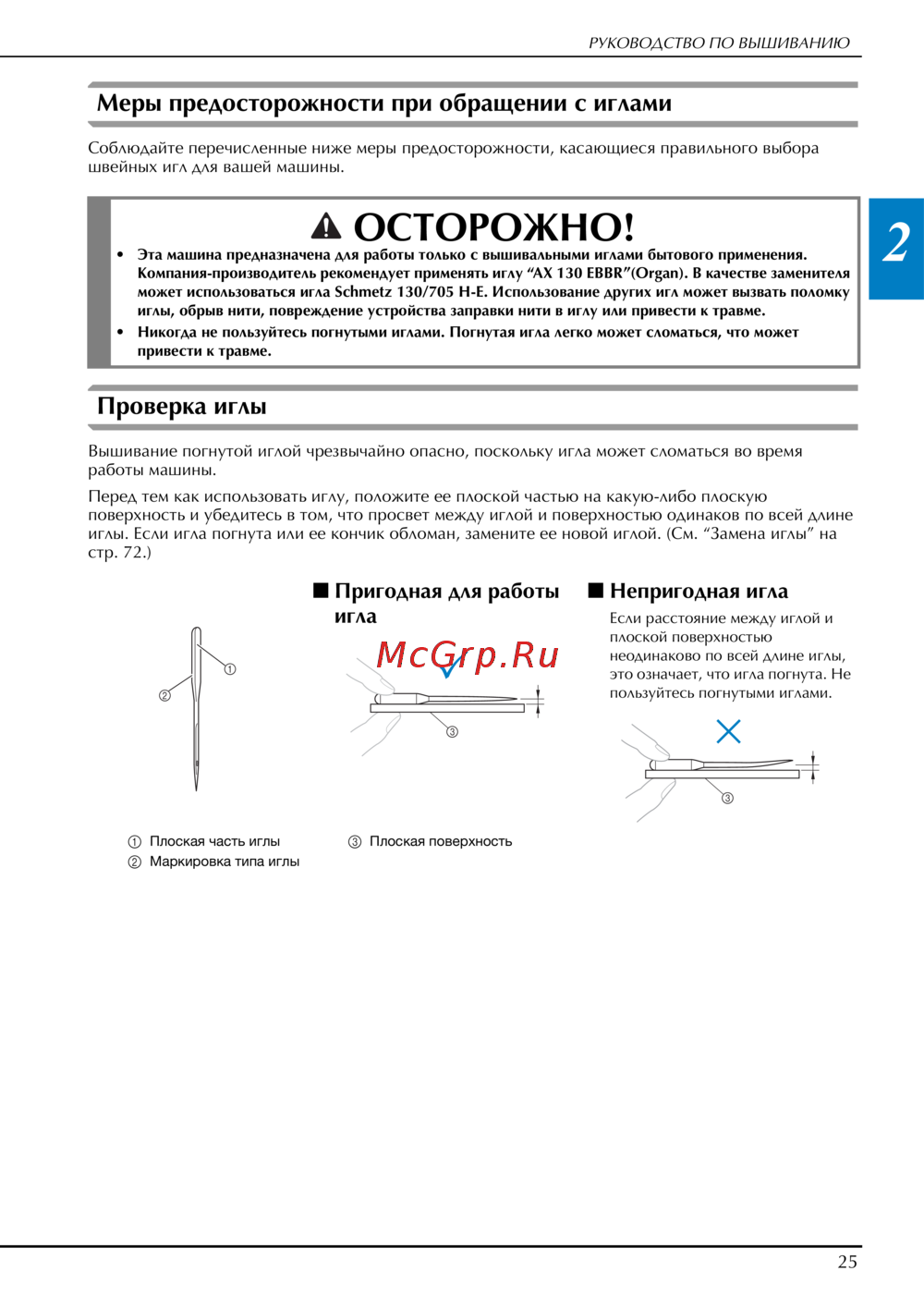 иглы, обрыв нити, повреждение устройства заправки нити в иглу или привести к травме.