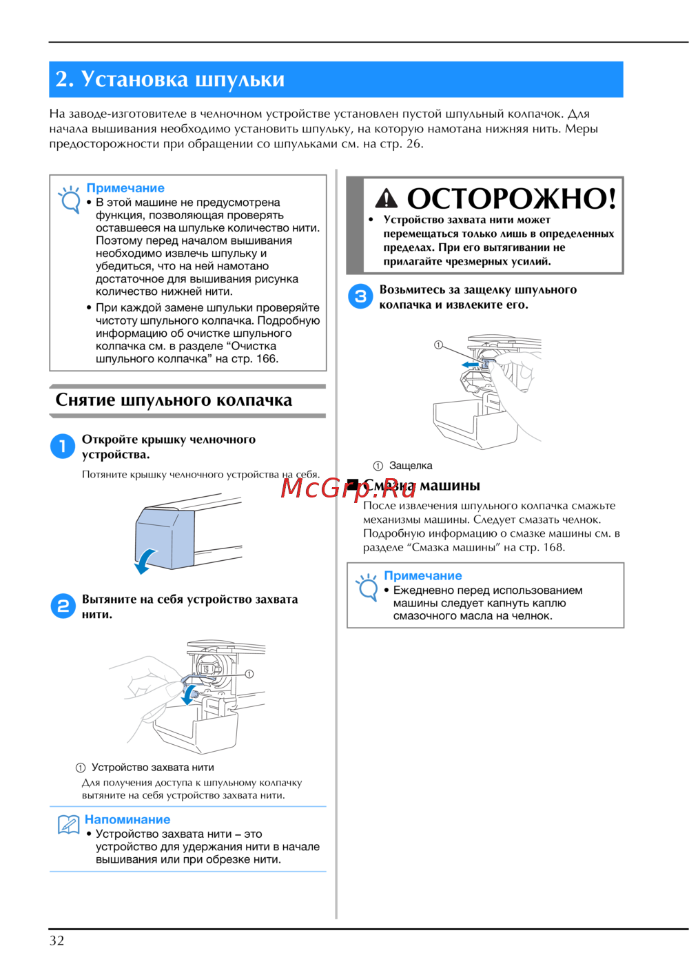 - Откройте крышку челночного устройства выньте шпульный колпачок а затем достаньте из него шпульку см стр 32 p.168
