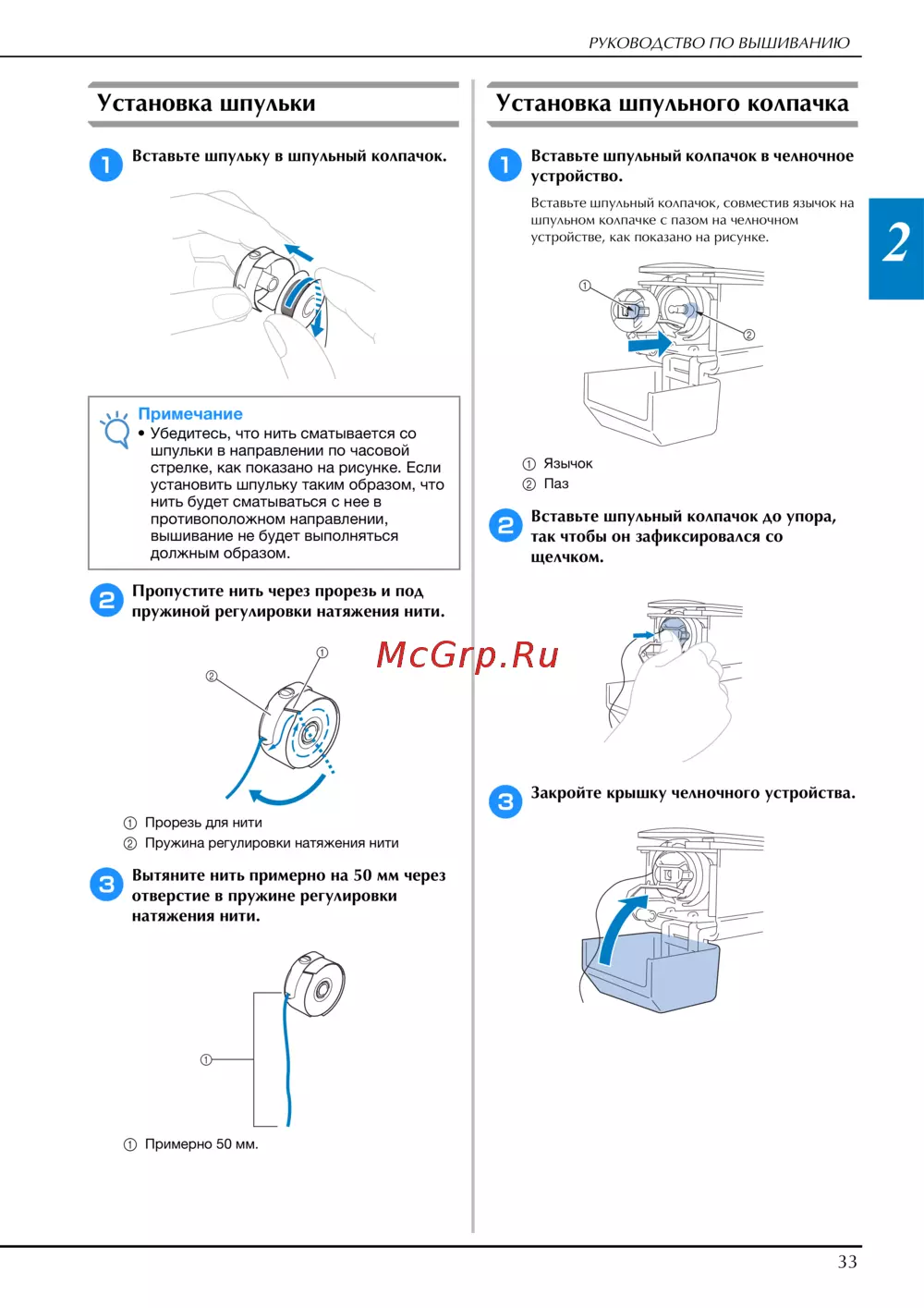 - Откройте крышку челночного устройства выньте шпульный колпачок а затем достаньте из него шпульку см стр 32 p.168